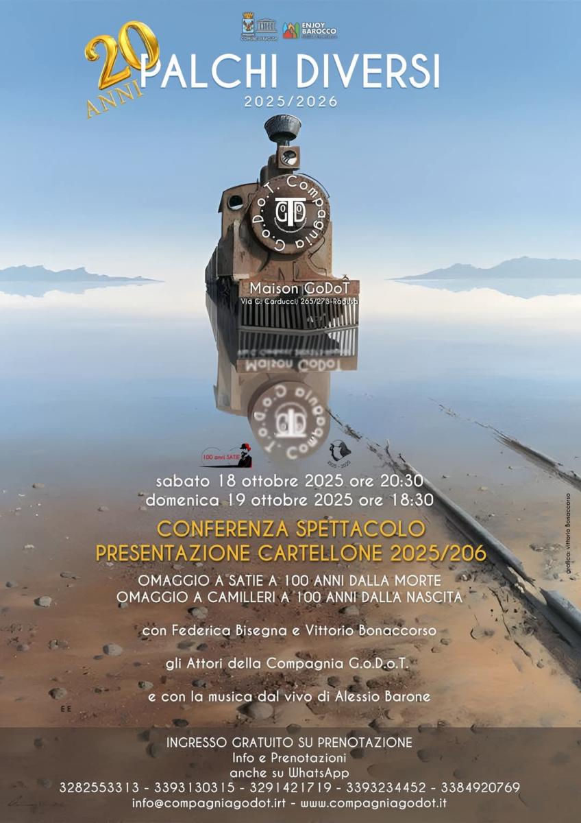 Sabato 18 ottobre e Domenica 19 ottobre la Compagnia GODOT di Ragusa presenta con una conferenza-spettacolo la sua rassegna teatrale “Palchi diversi 2025-2026”: la conferenza-spettacolo si terrà alla Maison GODOT di via Carducci n. 273, sarà gratuita ma per partecipare sarà necessaria la prenotazione.