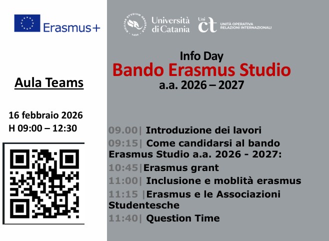 Il 16 febbraio dalle ore 9 alle ore 12,30 si svolgerà online su Microsoft Teams un Info Day sul bando Erasmus+ mobilità per studio a.a. 2026-27. Saranno fornite informazioni relative ai programmi di scambio e alle procedure per inoltrare la candidatura. Tutti gli studenti sono caldamente invitati a partecipare, accedendo tramite il QR code riportato nella locandina allegata