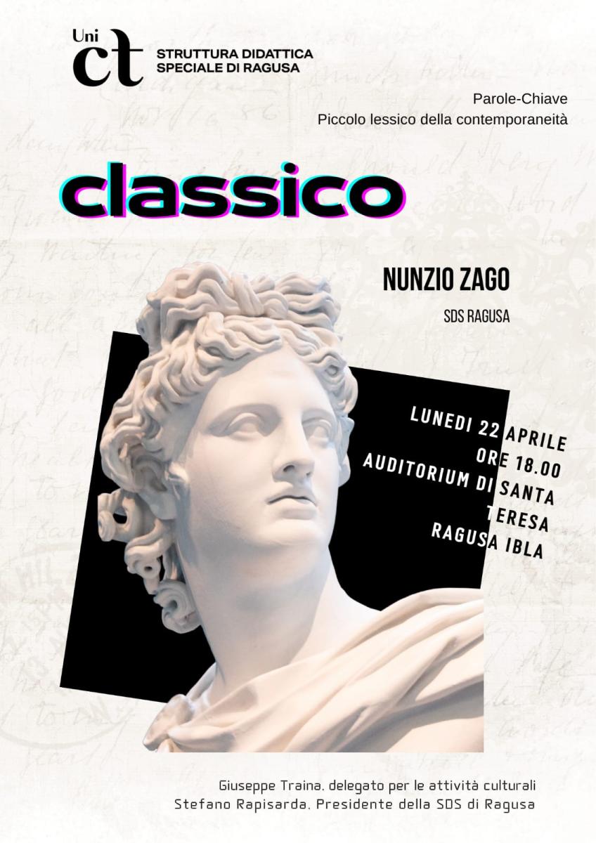 Riprende il ciclo di seminari "Parole-chiave" con una parola, "Classico", di cui si continua ad avvertire fortemente l'importanza. Ne parlerà il prof. Nunzio Zago, professore ordinario in quiescenza di Letteratura Italiana presso l'Università di Catania, Struttura Didattica Speciale di Ragusa.
